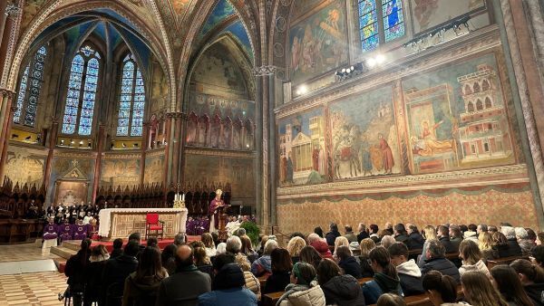 앙헬 페르난데스 아르티메 추기경이 2026년 2월 22일 이탈리아 아시시에 있는 성 프란치스코 대성전 상층부에 모인 순례자들에게 성 프란치스코 유해 참배를 위한 미사에서 강론을 하고 있다. OSV