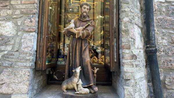 2026년 2월 22일, 이탈리아 아시시의 한 거리 상점 앞에 성 프란치스코 동상이 서 있다. OSV