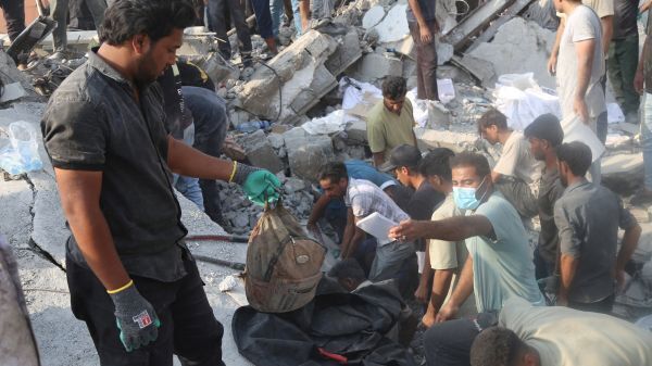 2026년 2월 28일, 이란 미나브의 한 학교에 대한 이스라엘의 공습 이후 주민들과 구조대원들이 현장에서 복구 작업을 하고 있다. OSV