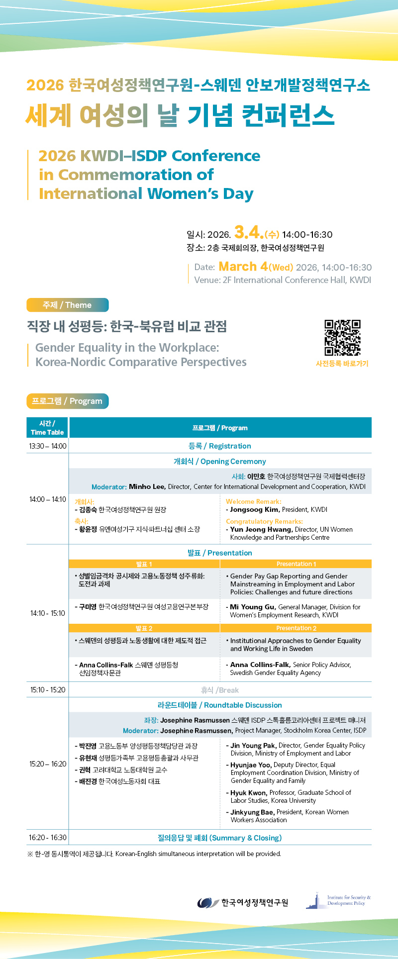 4일 연구원 국제회의장에서 열리는 콘퍼런스는 스웨덴 안보개발정책연구소와 공동 주최한다. 한국과 북유럽의 직장 내 성평등 경험을 살펴보고, 성별임금격차와 고용 격차를 해소하는 정책 방향을 모색하기 위해서다.