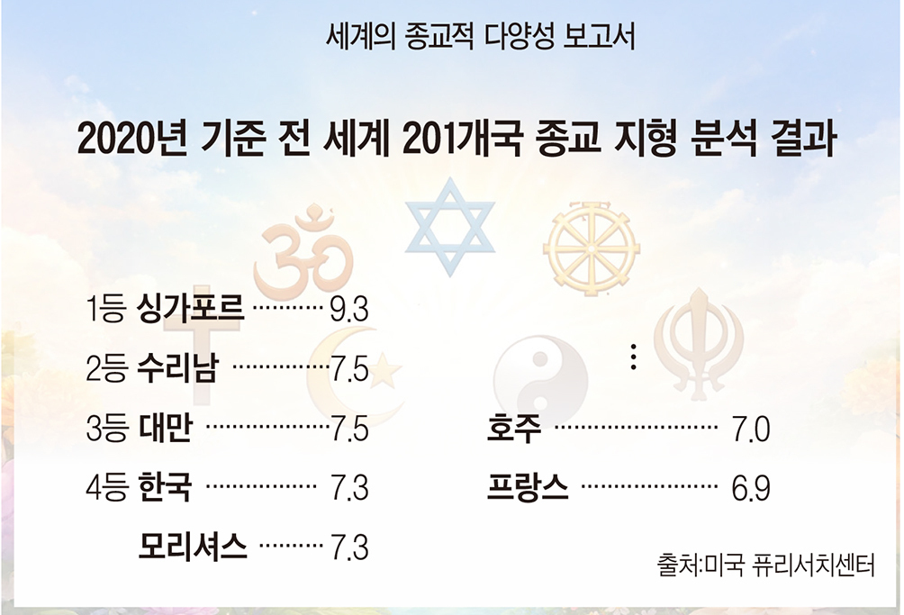 여러 권역 중 아시아-태평양 지역은 해당 지수가 8.7로 가장 높게 나타났다. 한국은 10점 만점 중 7.3점으로, 세계 4위를 기록했다. 다만 대만이나 싱가포르 같은 인구 규모가 작은 국가들을 제외하면 주요 선진국 중 가장 다양한 종교가 공존하는 나라인 셈이다. 싱가포르가 9.3점으로 1위, 수리남(7.5점), 대만(7.5점), 한국, 모리셔스(7.3점), 기니-비소(7.2점), 토고(7.1점), 베냉(7.1점), 호주(7.0점), 프랑스(6.9점) 순이다.