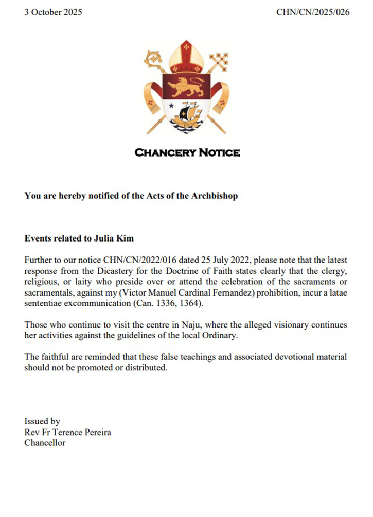 싱가포르대교구에서 2025년 10월 3일 공개한 공지문. 싱가포르대교구는 공지문을 통해 자국 사제와 수도자, 신자들이 나주 성모와 관련된 거짓 성사나 전례에 참여할 경우 자동 파문 될 수 있음을 알렸다. 싱가포르대교구 홈페이지 캡처