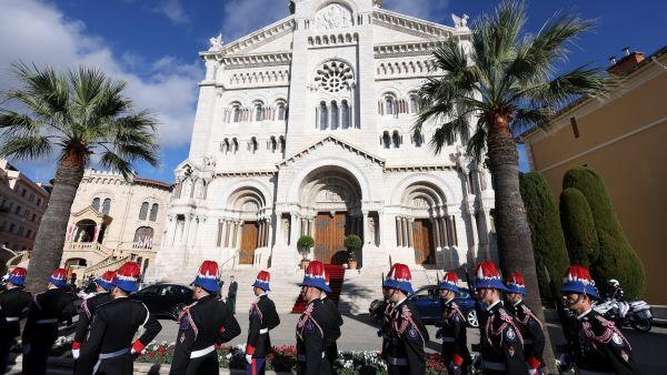 2023년 11월 19일, 모나코 국경일 기념 행사 중 알베르 2세 국왕의 경호원들이 원죄 없는 잉태 대성당 앞에 서 있다. 레오 14세 교황은 역사적인 하루 동안의 사도적 순방을 위해 2026년 3월 28일 모나코를 방문할 예정이다. OSV