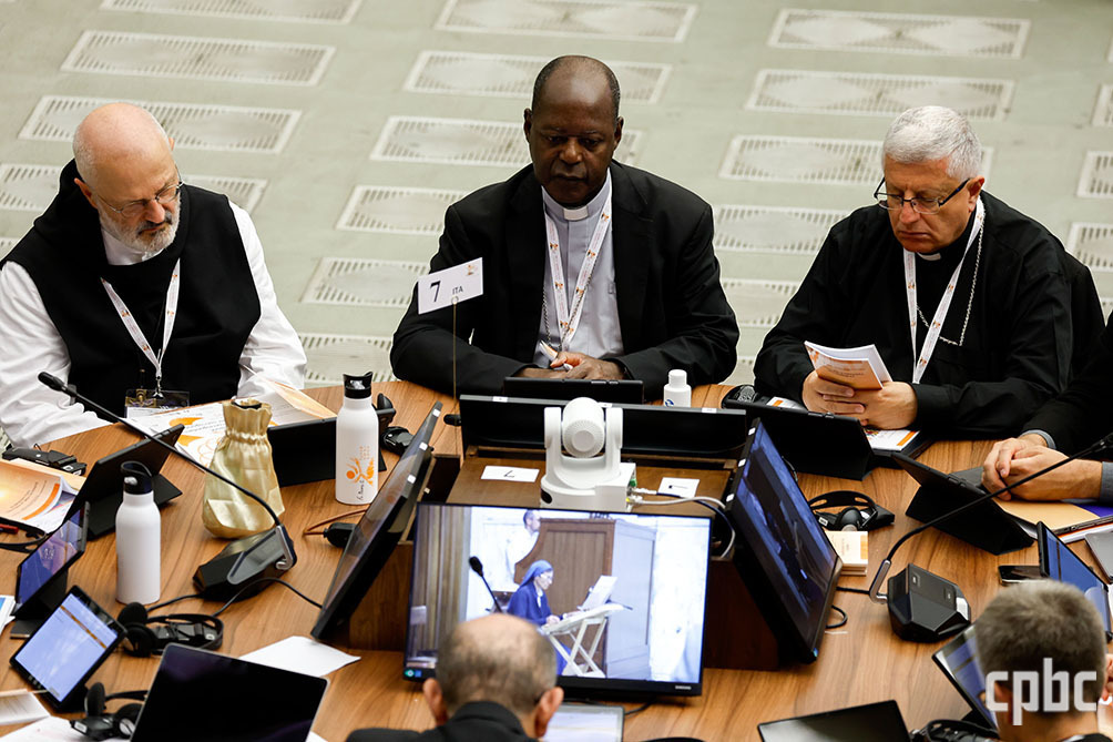 2023년 10월 바티칸 바오로 6세 홀에 모인 시노드 대의원들이 모임을 앞두고 기도하고 있다. OSV