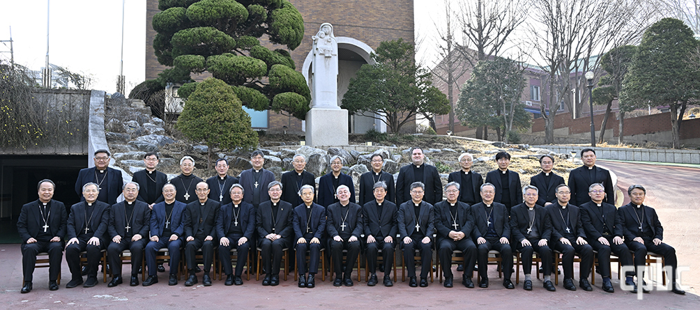 한국 주교단이 3월 9~11일 주교회의 2026년 춘계 정기총회에 참석, ‘모자보건법 일부 개정 법률안’에 대한 성명서 발표 등 한국 교회의 다양한 안건을 다뤘다. 기념 촬영을 하고 있는 한국 주교단.