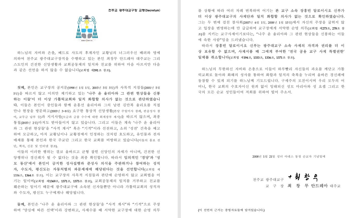 2008년 1월 21일 광주대교구장 최창무 대주교가 발표한 교령