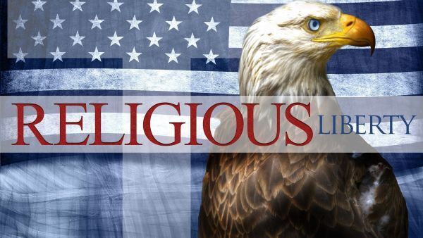 종교의 자유를 주제로 한 삽화에 흰머리독수리와 미국 국기가 그려져 있다 . OSV삽화