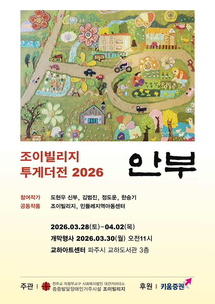 이번 전시는 2022년 ‘투게더전-조이빌리지 이야기’ 후 4년 만에 함께하는 자리로, 서로의 안부를 묻고 일상의 평화와 공존의 가치를 나누고자 기획됐다. 의정부교구 사회복지법인 대건카리타스가 운영하는 중증장애인 거주시설 조이빌리지(원장 김종민 신부)의 개원 7주년을 기념해 마련됐으며, 키움증권이 후원한다.