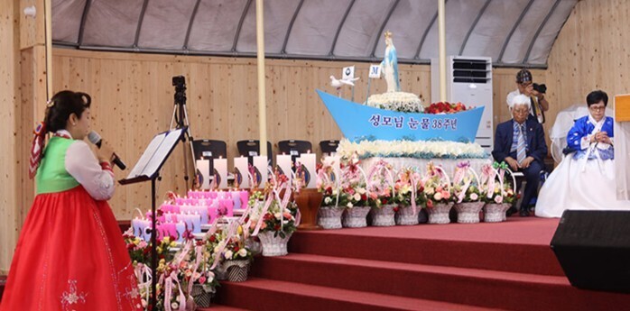 권영현 국민의힘 대변인은 2023년 7월 열린 나주 윤 율리아 기념행사에서 낭독을 하고 있다. 마리아의구원방주 홈페이지 캡처