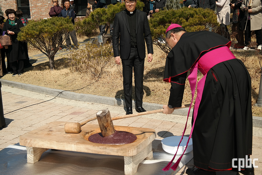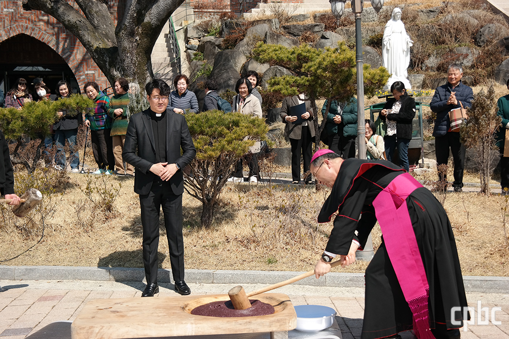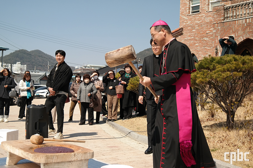 전주교구장 김선태 주교가 21일 순창성당에서 ‘2026년 풍년 기원 미사 및 생명농업 축복식’ 거행 후 떡메치기를 하며 신자들과 즐거운 시간을 보내고 있다.