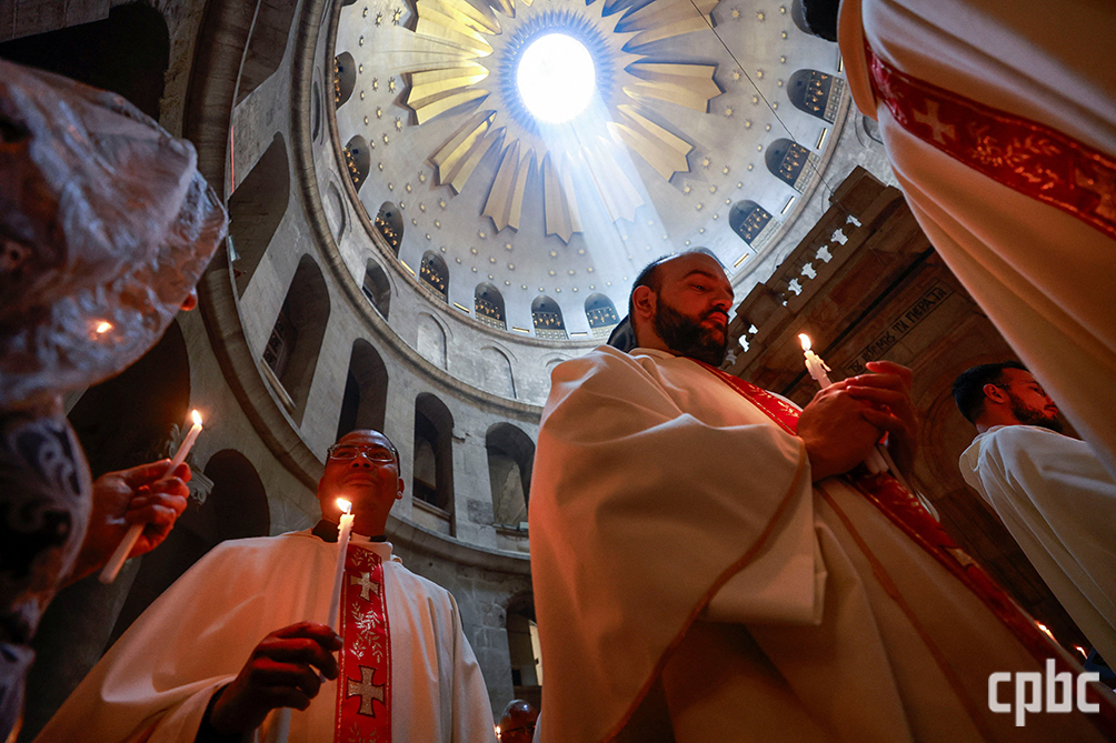 2025년 4월 예루살렘 성묘성당에서 거행된 성목요일 발 씻김 예식에 참여하기 위해 현지 사제들이 줄을 지어 입당하고 있다. OSV