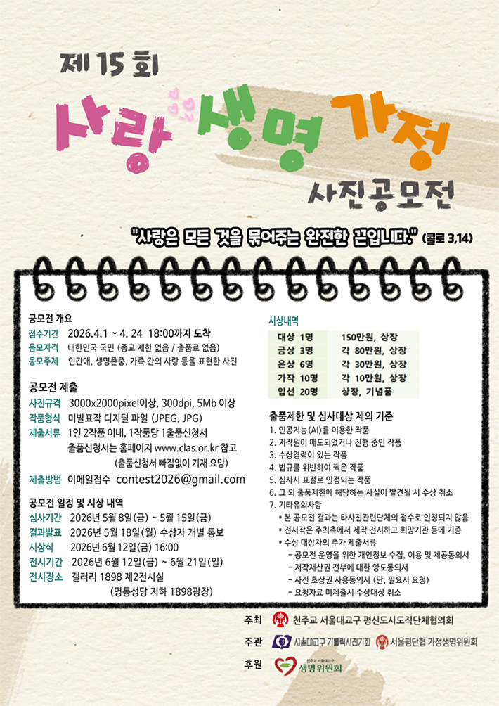 주제는 ‘인간애·생명존중·가족 간의 사랑’이다. 주제에 따라 표현한 사진을 규격에 맞게 이메일(contest2026@gmail.com)로 제출하면 된다. 1인당 두 작품까지 제출할 수 있으며, 작품당 출품 신청서를 내야 한다. 신청서는 홈페이지(www.clas.or.kr)에서 내려받을 수 있다.