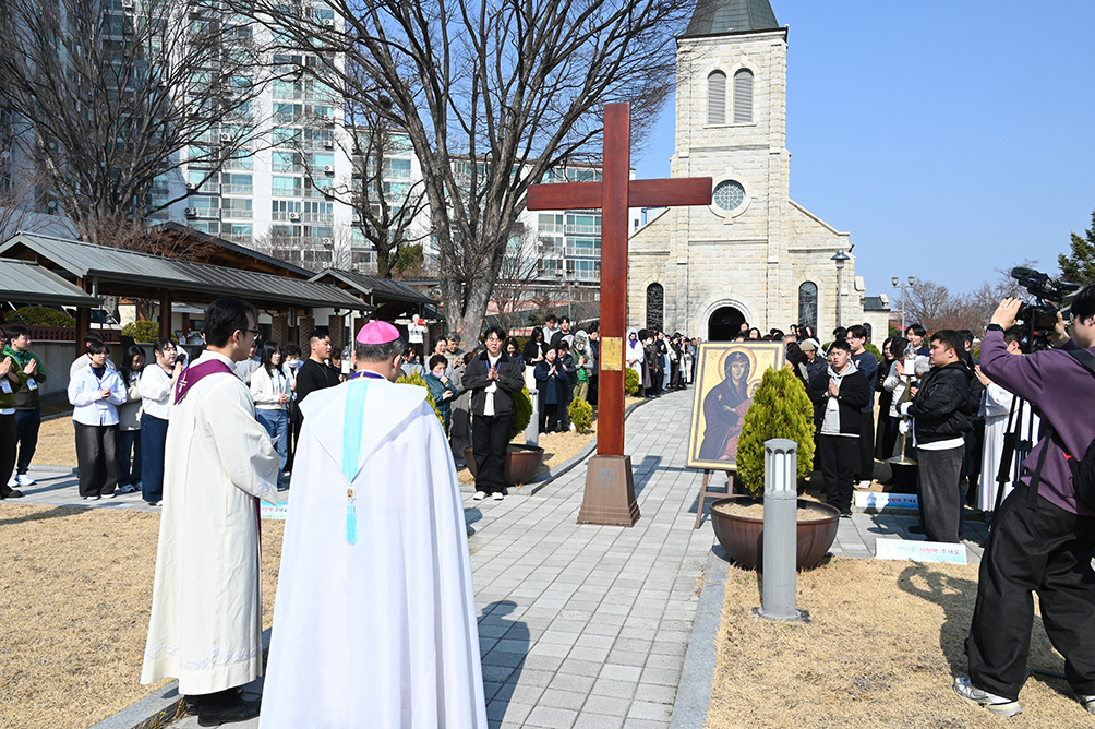 춘천교구는 세계청년대회(WYD)를 향해 교구 내 십자가·성모 성화 순례의 마지막 여정인 주교좌 죽림동본당 순례를 기념하며 22일 교구장 김주영 주교 주례로 환영 예식을 거행했다. WYD 십자가·성모성화 순례를 위해 한자리에 모인 교구 청년들을 비롯한 사제단과 수도자 200여 명은 순례가 무사히 막바지 여정에 다다른 것을 함께 축하했다. 또 상징물 순례를 계기로 2027 서울 WYD의 성공적인 개최를 위해 다시 힘을 모으기로 다짐했다.