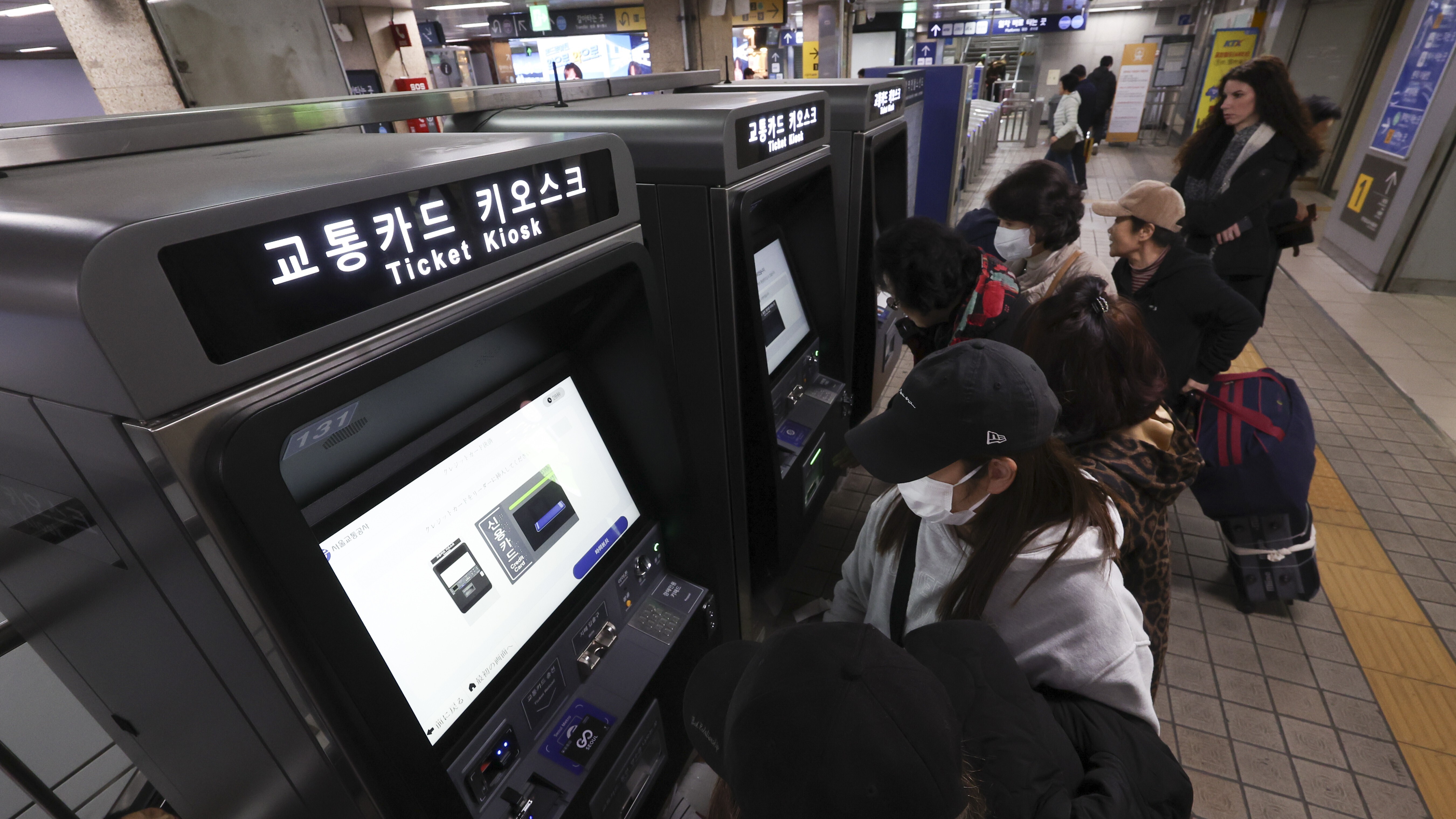 17일 오후 서울 지하철 서울역사 내에 설치된 교통카드 승차권 발매기에서 외국인들이 승차권을 발급받고 있다. 뉴시스