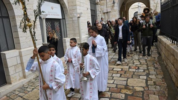2026년 3월 29일, 예루살렘 구시가지의 성 사비오르 수도원 밖에서 팔레스타인 가톨릭 신자들이 성지주일 올리브 가지 축복 행렬에 참여하고 있다. 이스라엘 후방 사령부는 미국과 이스라엘의 이란 전쟁 발발을 이유로 전통적인 성지주일 행렬을 취소했다. OSV