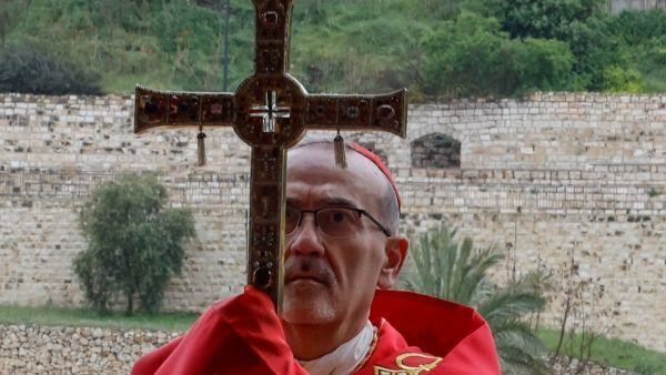 예루살렘 라틴 총대주교 피에르 바티스타 피자발라 추기경이 2026년 3월 29일 예루살렘에서 성지 주일 기념 기도회를 열고 있다. 이날은 대규모 모임 제한과 미국-이스라엘과 이란 간 전쟁으로 인해 올리브산에서 열리는 전통적인 성지주일 행렬이 취소됐다. OSV