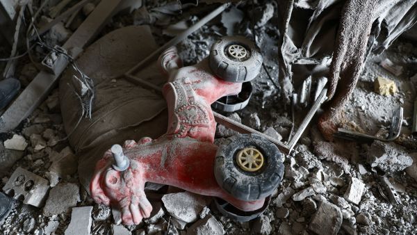 2026년 3월 27일, 이란 테헤란에서 미국과 이스라엘 간의 전쟁 중 발생한 공습으로 파괴된 주거용 건물 잔해 속에 장난감 하나가 놓여 있다. OSV
