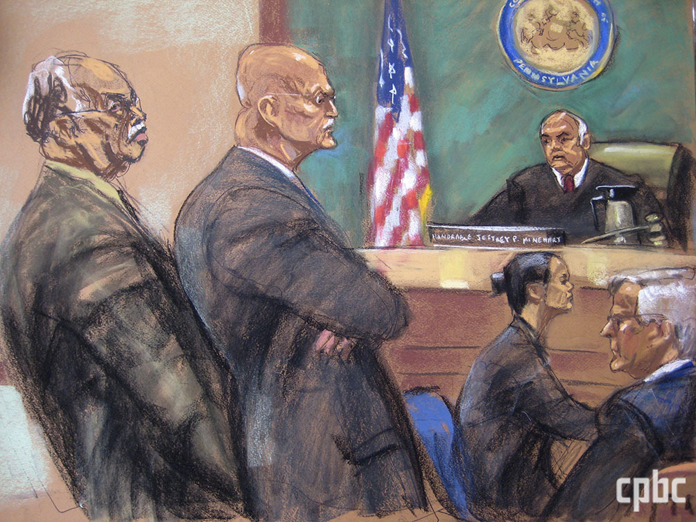 2013년 5월 15일 미국 필라델피아 지방법원에서 열린 커밋 배런 고스넬의 선고 공판 당시, 법정에서 그린 고스넬의 초상화 스케치다. OSV
