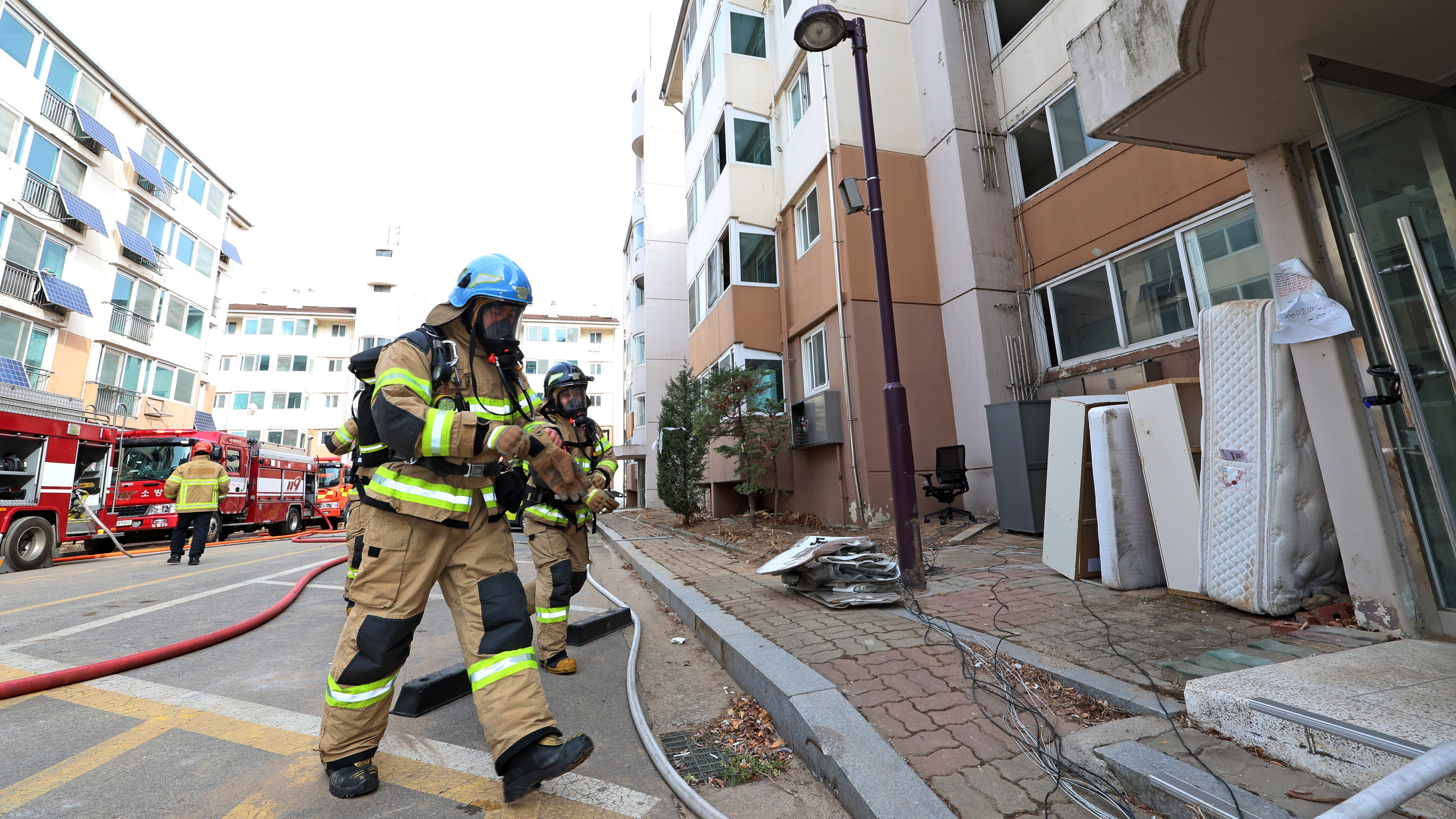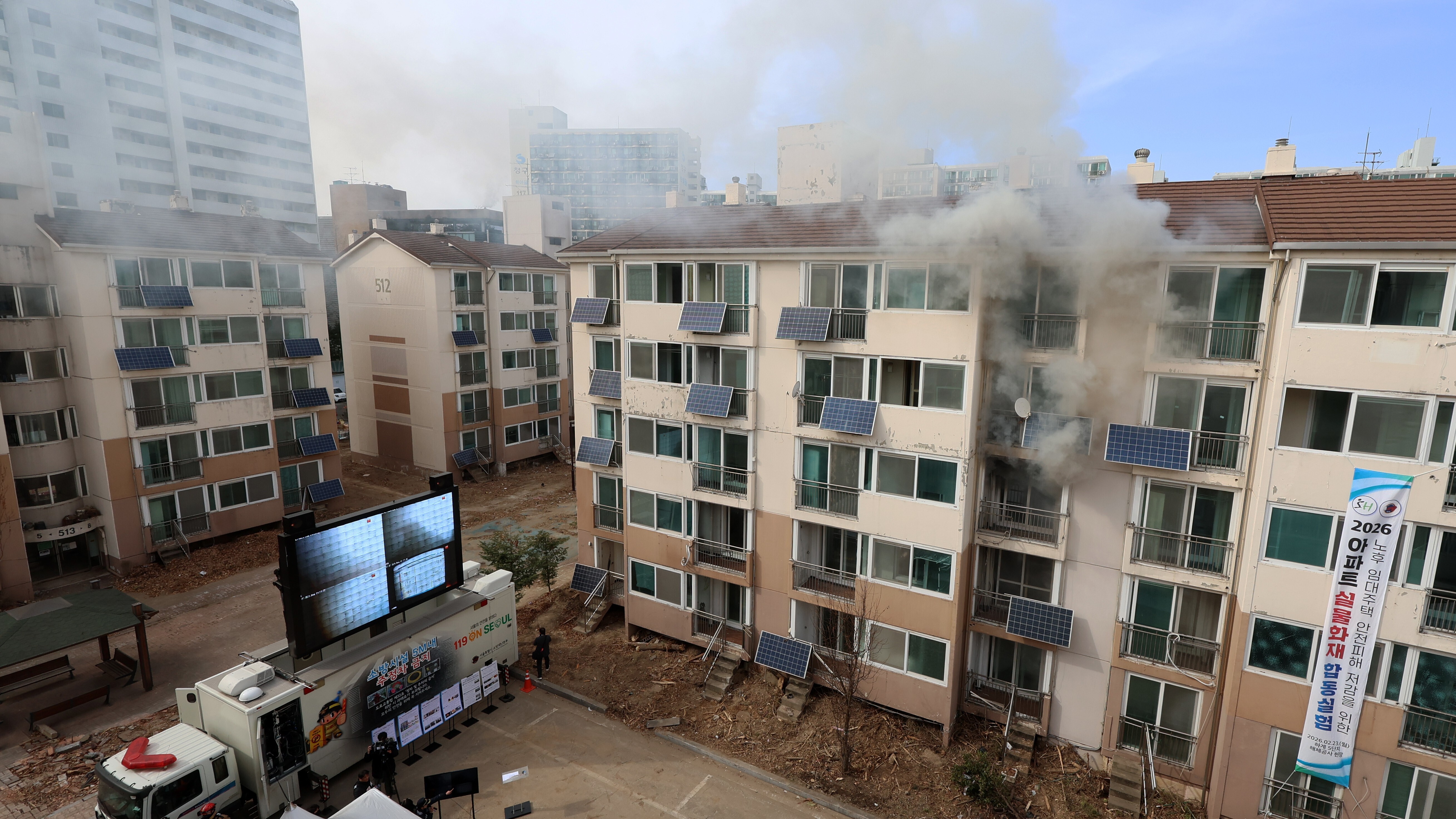 2월 23일 오후 서울 노원구 하계5단지 아파트에서 열린 스프링클러 미설치 노후 임대주택 대안 모색 및 안전 피해 저감을 위한 공동주택 실물화재 합동실험에서 소방대원들이 화재 진압을 위해 투입되고 있다. 뉴시스