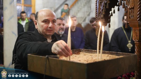 가자지구 성가정 성당의 가브리엘 로마넬리 신부가 2024년 12월 22일 촛불을 켜고 있다. 로마넬리 신부는 2026년 4월 6일 자신의 X 계정에 올린 영상에서 주님 부활 대축일에 레오 14세 교황으로부터 메시지를 받았다고 밝히며 "교황께서는 메시지와 때로는 전화로 끊임없이 우리와 소통해 오셨다"고 말했다. OSV