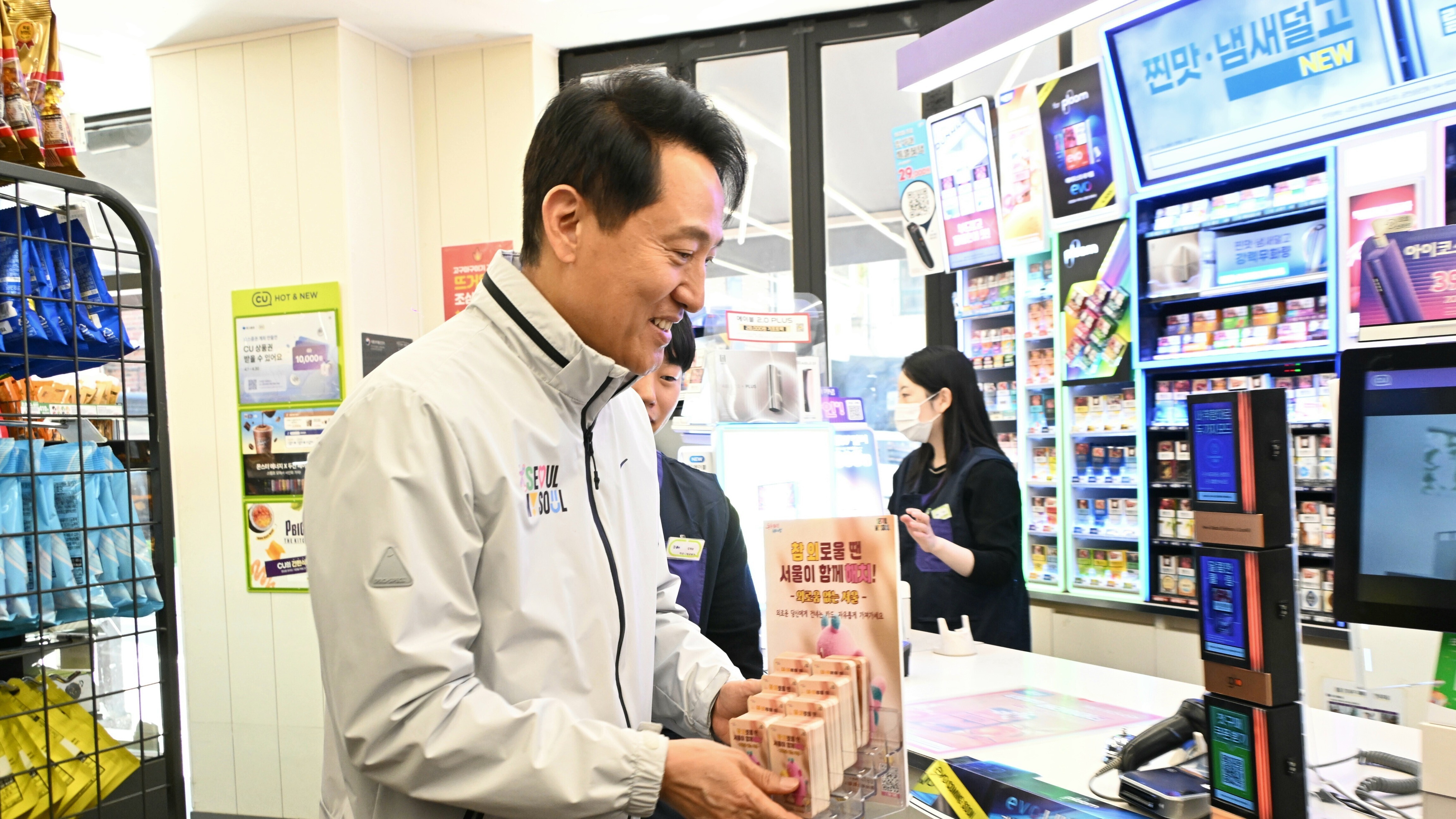 오세훈 서울시장이 7일 CU(씨유) 마로니에점에 ‘외로움 없는 서울’ 포토카드를 비치하고 있다. 서울시 제공