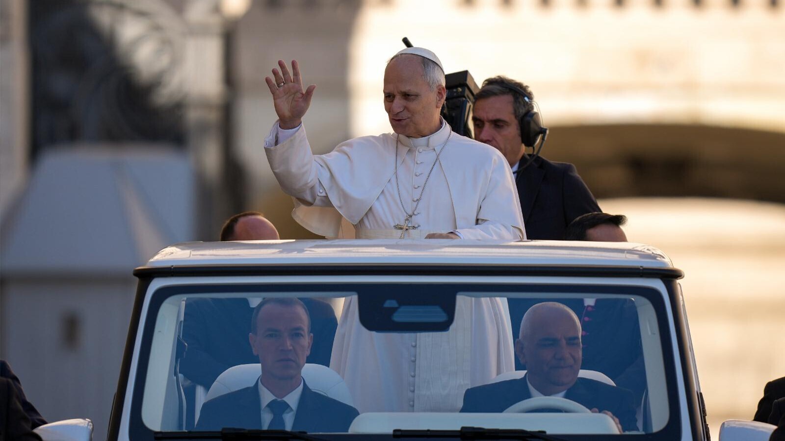레오 14세 교황이 8일 일반 알현에 앞서 바티칸 성 베드로 광장을 돌며 교황 전용차에서 방문객과 순례자들에게 인사하고 있다. OSV