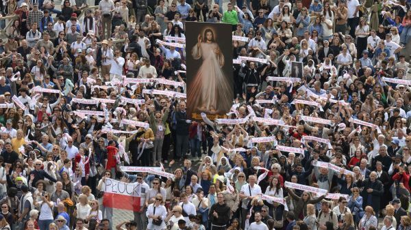 레오 14세 교황이 2026년 4월 12일, 바티칸 성 베드로 광장에서 '부활 삼종 기도'를 인도하는 동안 순례자들이 모여 있다. OSV