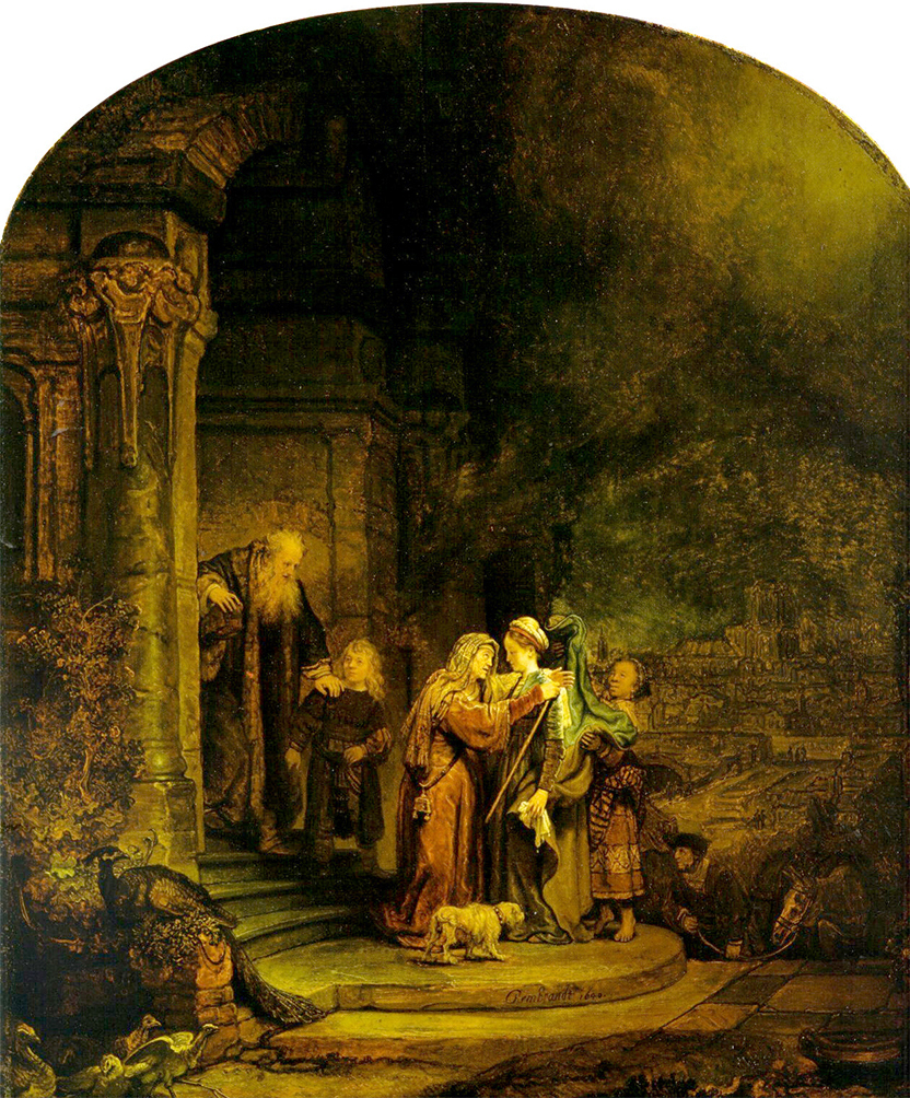 그런데 렘브란트가 1640년에 그렸고, 루카복음 1장 39-56절이 배경이며, 미국 디트로이트 미술관에 소장되어 있는 ‘마리아의 엘리사벳 방문’을 보면 의아한 게 한두 개가 아니다. 왜 마리아는 걸음을 서둘러 유다 산골로 달려가지 않고, 마부를 거느리고 말을 타고 여행했을까? 왜 흑인 시녀가 마리아에게 녹색 망토를 입히는 것일까? 왜 마리아는 베일을 쓰지 않고 왕관 모양의 모자를 쓰고 있는 것일까? 왜 사제 즈카르야는 궁궐 같은 집에서 나와 계단으로 내려오는 것일까? 왜 공작새는 등을 돌리고, 닭들은 마리아를 향해 환호하듯 달려가는 것일까? 왜 배경에 예루살렘 성전이 암흑 속에 감추어져 있을까?