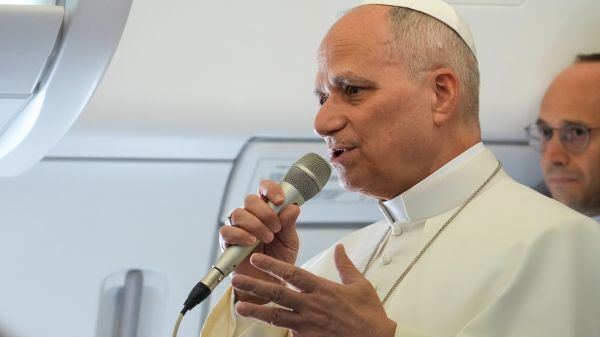 레오 14세 교황이 2026년 4월 13일, 알제리로 향하는 비행기 안에서 기자회견을 하고 있다. 미국 출신인 교황은 이날 도널드 트럼프 대통령이 이란과의 전쟁을 두고 자신을 맹렬히 비난한 것에 대해 기자들에게 바티칸의 평화와 화해를 위한 호소는 복음에 뿌리를 두고 있으며, 자신은 트럼프 행정부를 두려워하지 않는다고 반박했다. OSV