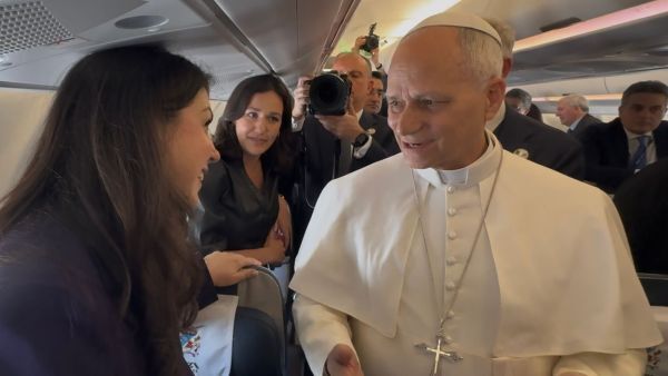 OSV 뉴스 바티칸 편집장 코트니 마레스가 2026년 4월 13일 알제리로 향하는 교황 전용기 안에서 레오 14세 교황과 대화를 나누고 있다. OSV