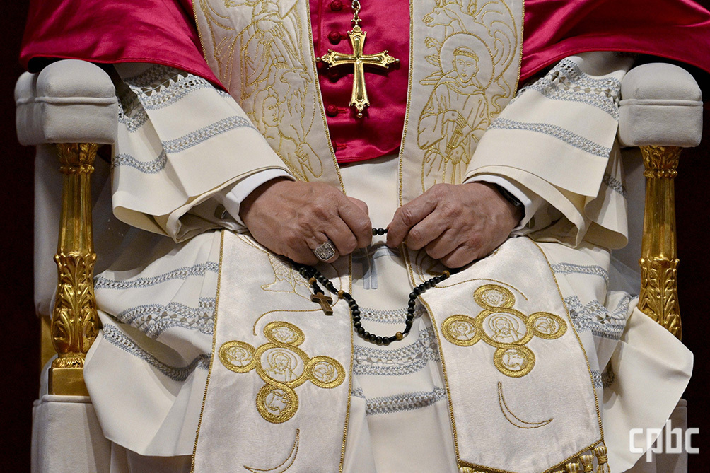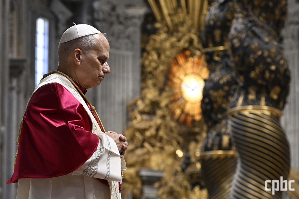레오 14세 교황이 11일 바티칸 성 베드로 대성전에서 평화 회복을 위한 밤 기도를 주례하며 묵주기도를 바치고 있다. OSV