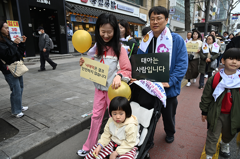 아내와 함께 유모차를 끌고 행진에 참여한 전주용(46)씨는 “낙태 관련 영화를 보고 심각성을 느끼게 됐다”며 “사랑하는 우리 아이와 다름없는 생명이 사람들의 무지나 잘못된 인식 속에 빛도 보지 못하고 사라지는 일이 더는 있어선 안 될 것”이라고 했다. 6살 된 아들의 손을 잡고 행진하던 신다정(39)씨는 “아이도 행진하면서 자신이 소중한 존재임을 느끼는 것 같다”며 계속 참여할 의사를 밝혔다.