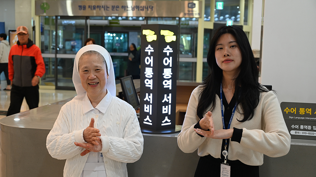 가톨릭대 성빈센트병원 영성부원장 박명희 수녀와 수어 통역사 이주희씨가 병원 본관 1층 의료수어 통역서비스 안내 데스크에서 수어로 인사하고 있다.
