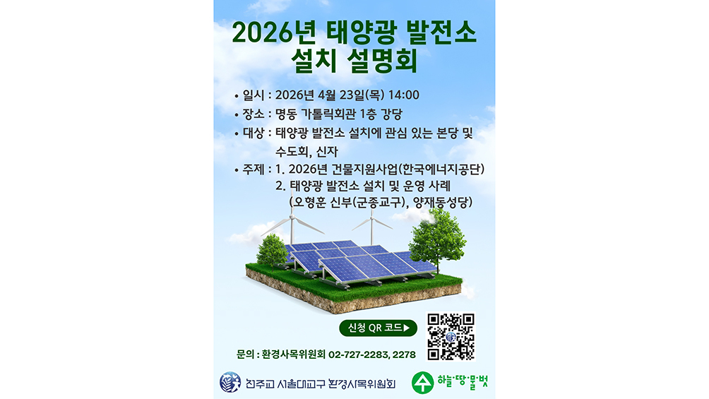 서울대교구 환경사목위원회(위원장 이재돈 신부)는 23일 오후 2시 서울 명동 가톨릭회관 1층 강당에서 ‘2026년 태양광 발전소 설치 설명회’를 연다. 각 본당과 수도회·신자들에게 태양광 발전소 설치 방법과 보조금 혜택·실제 운영 사례를 중심으로 에너지 전환과 탄소중립 실천을 위한 구체적 방안을 안내하기 위해서다.