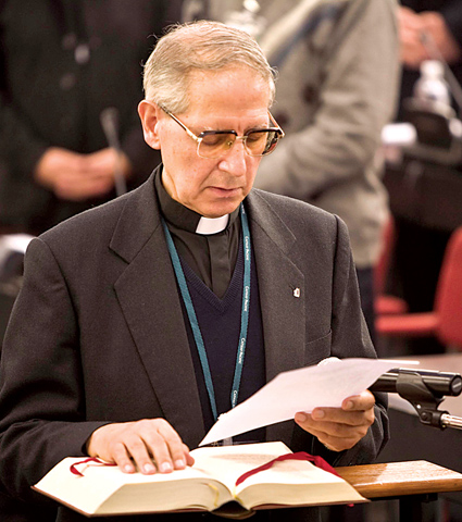 ▲ 아돌포 니콜라스 신부가 19일 예수회 총회에서 30대 총장에 선출된 후 선서를 하고 있다.