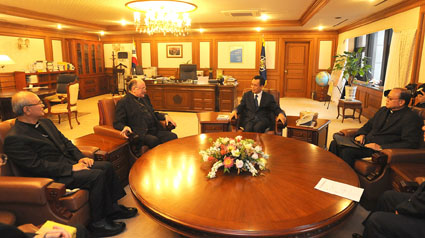 ▲ 마르티니 추기경이 10월 31일 주한 교황대사 오스발도 파딜랴(오른쪽) 대주교와 함께 정부종합청사 내 국무총리실을 예방, 한승수(왼쪽에서 세 번째) 국무총리 등 정부 관계자들과 대화를 나누고 있다.