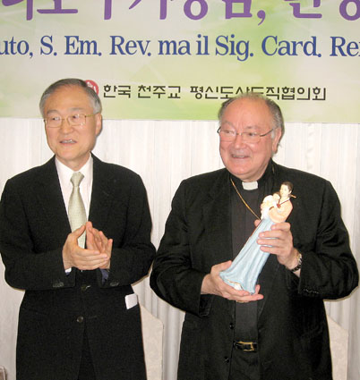 ▲ 마르티니(오른쪽) 추기경이 1일 한홍순 한국평협 회장에게 한복 차림 성모자상을 선물받고 기뻐하고 있다.