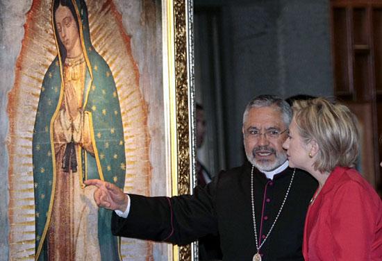 힐러리 클린턴 미국 국무장관이 3월 26일 멕시코 과달루페의 성모 대성당을 방문해 디에고 몬로이 신부로부터 과달루페의 성모에 대해 설명을 듣고 있다(CNS).