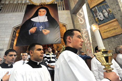 11월 22일 나자렛의 주님탄생예고 성당에서 열린 마리-알폰시네 가타스(1843~1927) 수녀 시복식에서 수녀의 대형 초상화 아래로 행렬이 지나가고 있다. 예루살렘의 거룩한 로사리오의 도미니칸 수녀회 설립자인 가타스 수녀 시복미사는 예루살렘의 푸아드 투왈 총대주교가 집전했으며, 3000명이 넘는 신자들이 참여했다. 【나자렛=CNS】