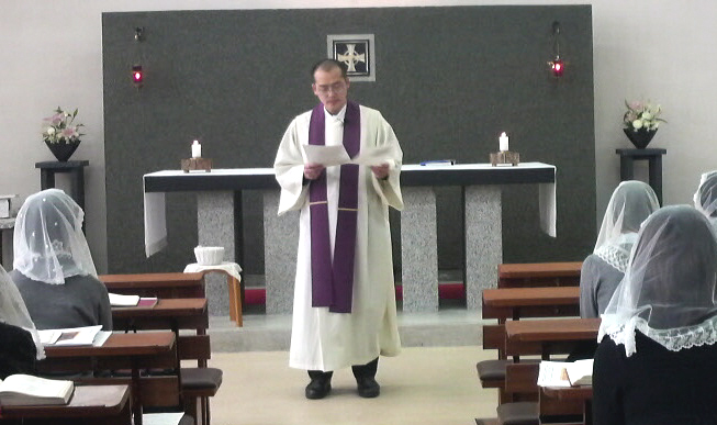 ▲ 일본 아키타현 아키타시 쯔치자키본당 김일 보좌신부가 20일 봉헌한 미사 중 실의에 빠진 신자들에게 위로의 말을 건네고 있다.
