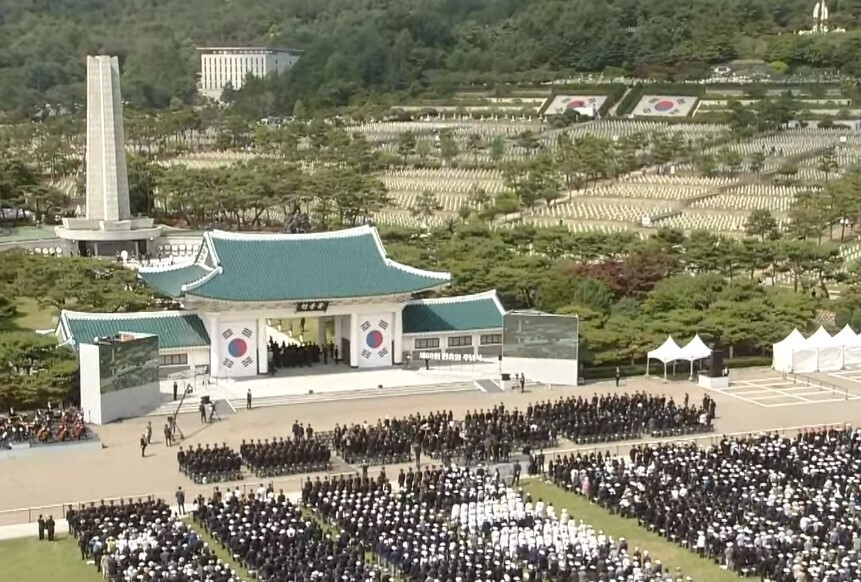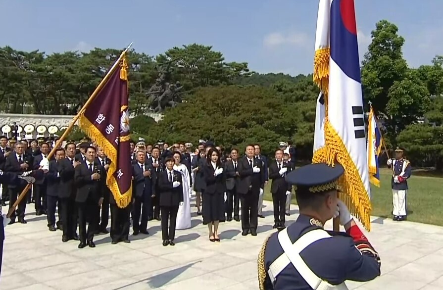 강력한 안보 태세를 강조하면서 호국영령들을 향한 예우를 표현한 것입니다. 윤 대통령과 김건희 여사는 추념식에 앞서 고 김봉학 육군 일병의 유해를 동생 고 김성학 일병 묘역에 안장하는 '호국의 형제' 안장식에 참석했습니다.