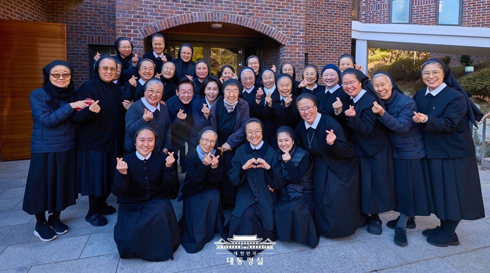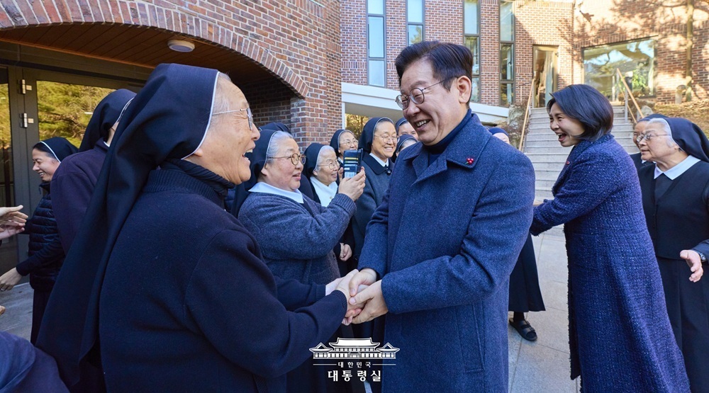 이재명 대통령 부부가 25일 인천 노틀담 수녀회 본원을 방문해 수녀들과 인사하고 있다. 대통령실 제공