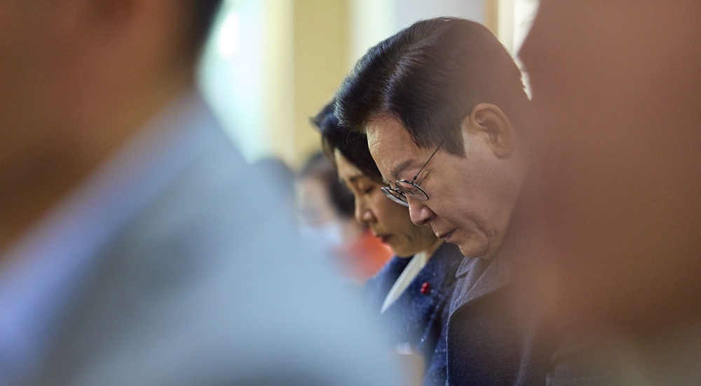 이재명 대통령 부부가 25일 오전 인천 해인교회 성탄 예배에서 기도하고 있다. 대통령실 제공