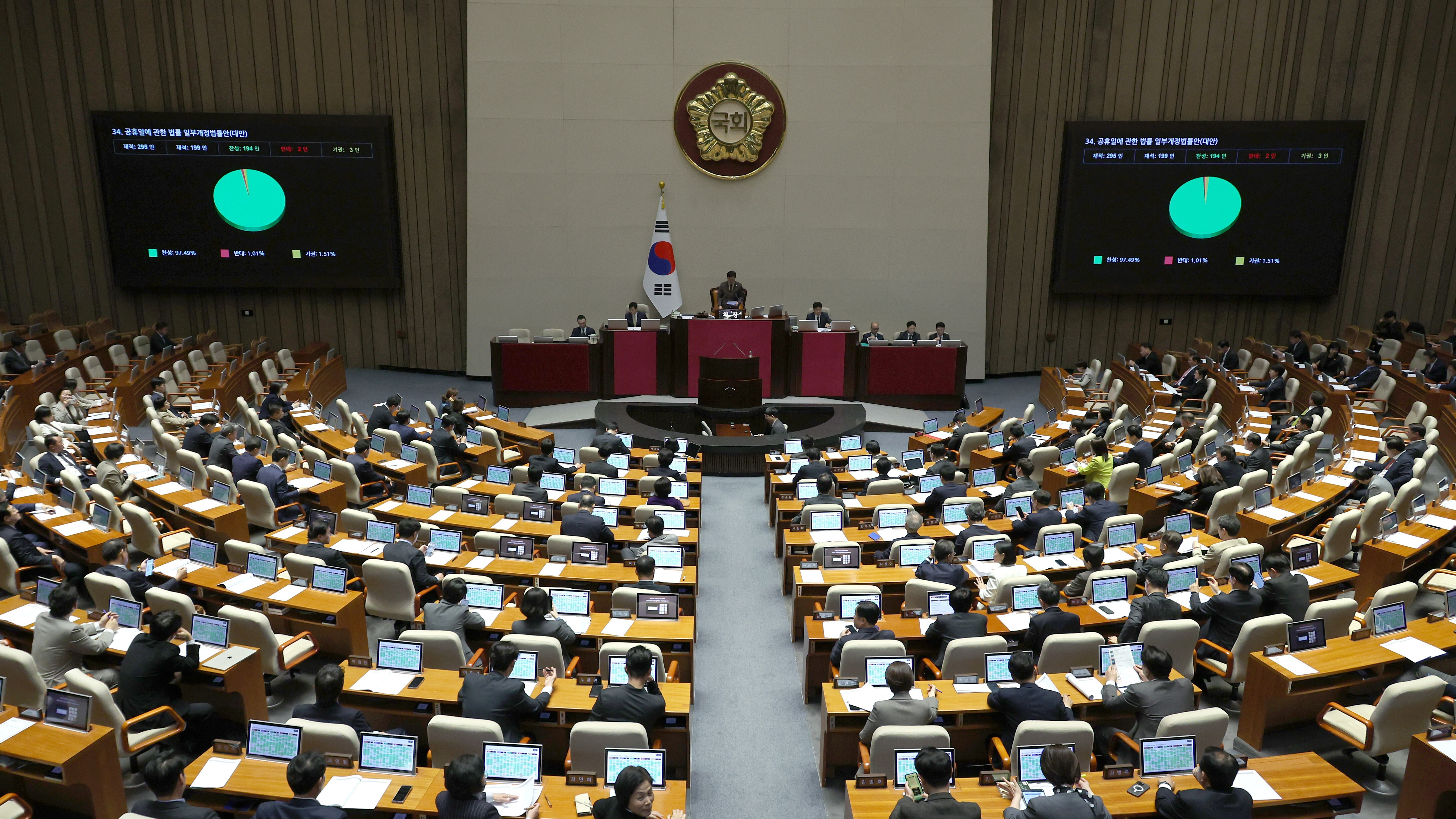 31일 오후 서울 여의도 국회에서 열린 제433회국회(임시회) 제3차 본회의에서 공휴일에 관한 법률 일부개정법률안(대안)이 가결되고 있다. 뉴시스