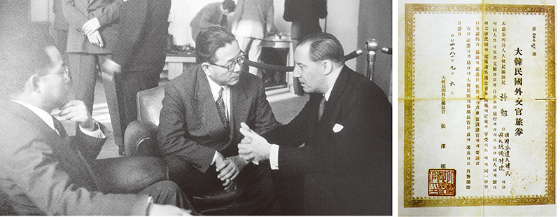 | ▲ 1948년 유엔 총회에 특사로 파견된 장면 수석대표가 한 외국 대표에게 신생 대한민국 정부 승인에 찬성해 줄 것을 호소하고 있다. 오른쪽은 당시 장면 대표에게 발급된 외교 여권. 출처=「건국·외교·민주의 선구자 장면」 |