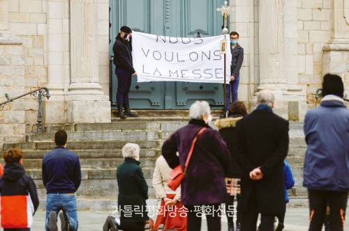 | ▲ 마스크를 쓴 신자들이 지난달 22일 프랑스 북부 캉브레에 있는 은총의 성모대성당 앞에서 ‘우리는 미사를 원한다’고 쓴 현수막을 들고 종교집회 금지를 포함한 정부의 2차 봉쇄 조치에 항의하고 있다. 【CNS】 |
