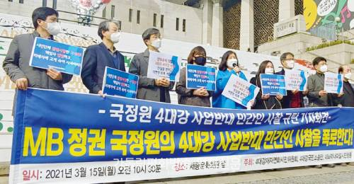 4대강재자연화시민위원회와 4대강 국민소송단, 내놔라 내파일 시민행동 등 3개 단체는 15일 서울 세종문화회관 앞에서 기자회견을 열고 4대강 사업을 위한 민간인 불법사찰을 규탄하고 책임자 처벌을 촉구했다. 이들 단체는 성명에서 “민간단체와 관련 인사들의 동향과 정보를 불법적인 사찰로 취득해 청와대에 전달했다”며 문건 8개를 공개했다. 문건은 2월 2일 녹색연합 등 시민 환경단체들이 국정원을 상태로 4대강 사업반대 단체에 대한 사찰ㆍ공작의 정보 공개를 청구했고, 국정원이 공개한 것으로 2007~2008년 작성한 것이다.