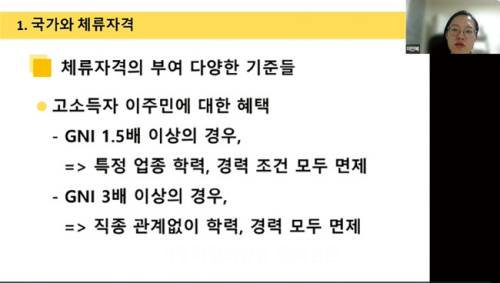 이 변호사는 “이주민 정책을 보면 이주민에 대한 우리 사회의 태도를 알 수 있다”면서 “이주민 체류자격의 연장과 변경 절차를 담고 있는 출입국 사무소 매뉴얼을 살펴보면 한국 사회의 편견이 그대로 담겨 있다”고 지적했다. 외국인 유학생의 경우 체류 자격 연장을 받기 쉬운 학교가 있고 아닌 학교가 있는데, 이를 세계 대학 평가 순위로 따지는 학벌주의적 정책이 한 예다. 이 변호사는 또 한국 국적을 취득하기 위한 자격 요건을 설명하면서 자산이 많거나, 인재에게만 혜택을 주는 차별 요소를 꼬집었다.