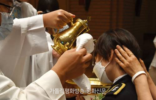 | ▲ 서울대교구 주교좌 명동대성당 파밀리아 채플에서 2일 열린 경찰사목위 세례식에서 한 경찰이 세례를 받고 있다. |