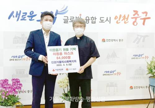 인천가톨릭사회복지회(회장 이상희 신부)는 8일 인천광역시 중구에 코로나19 방역을 위한 어린이용 마스크 6만 4000장을 기부했다.<사진> 이번 후원은 코로나19가 다시 확산세인 가운데 인천 중구 내 취약계층 어린이들이 감염에 대비할 수 있도록 하고자 이뤄졌다. 후원 마스크는 중구 내 행정복지센터를 통해 지원될 예정이다.